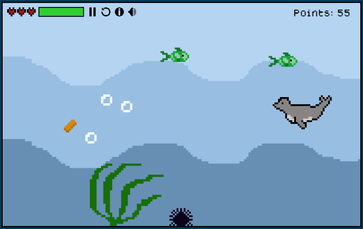 Pixel graphic game about a little seal in the ocean. I worked a lot on this one, and I'm really proud of it. Features the plushies of my siblings. You can see its previous stages here.